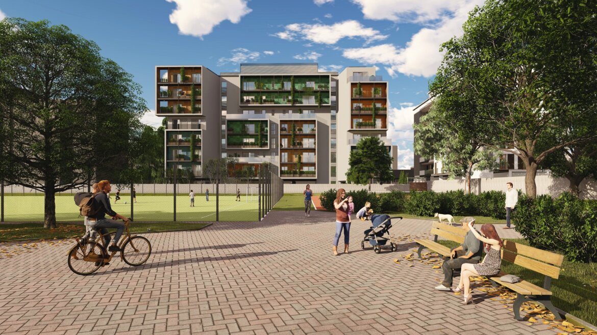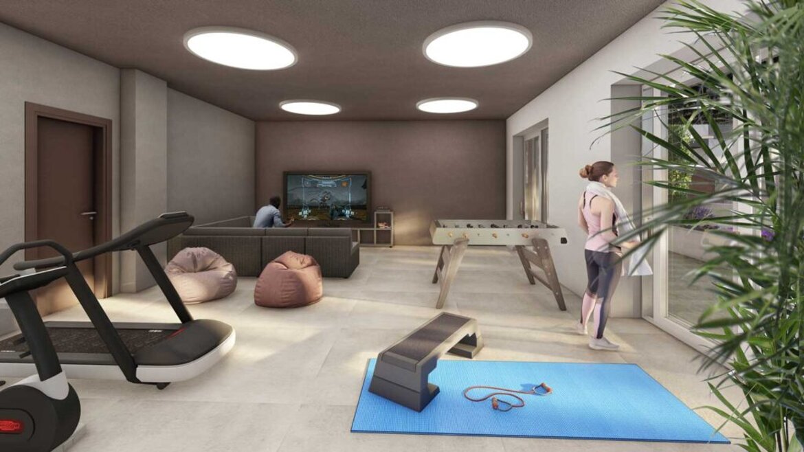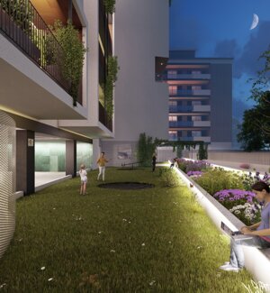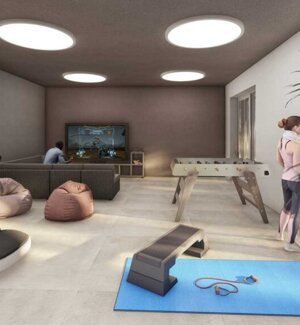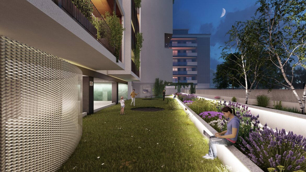 Il cuore della vita condominiale dell'edificio si svolge al piano terra con una sala ricreativa che guarda verso un pergolato in armonia con il giardino condominiale allestito con un'area gioco per i più piccoli.